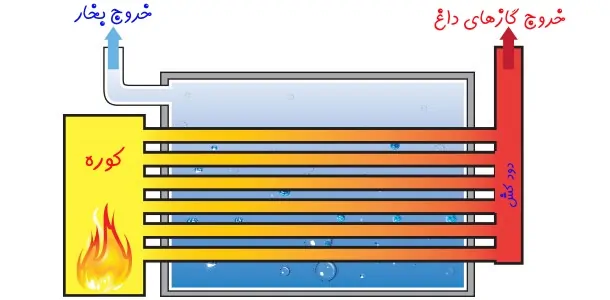 - فایرتیوب (Fire-tube Boiler): شعله و گازهای داغ از داخل لولههایی درون آب عبور میکنند؛ مناسب برای ظرفیتهای پایین و متوسط.