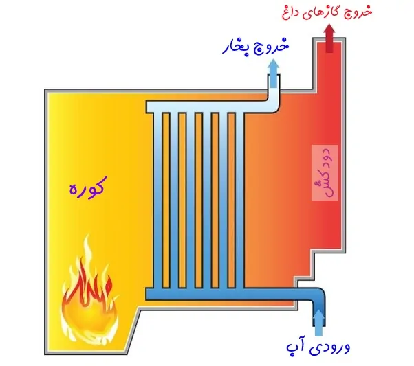 - واترتیوب (Water-tube Boiler): آب در داخل لولههایی جریان دارد که توسط شعله بیرونی گرم میشوند؛ برای ظرفیت و فشار بالا کاربرد دارند.